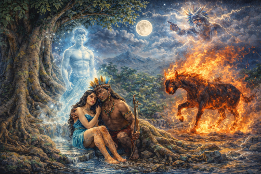 Mas como tudo que é bom sempre encontra um empecilho para atrapalhar, apareceu um índio puri chamado Ipojuca, que também se apaixonou pela bela Guaíra. Não conseguindo atrair o amor de Guaíra para si nem sufocar seu amor, ele planejou matar Mucuri tão logo tivesse uma oportunidade. Um dia, após a festa da lua cheia, Ipojuca convidou Mucuri para irem até a tribo dos goitacazes e iniciaram a caminhada. Logo que passaram pela figueira, já na Trilha dos Goitacazes, aproveitando uma distração de Mucuri, Ipojuca, com uma adaga rústica, cortou a cabeça de Mucuri e, para não deixar rastros de seu crime, enterrou o corpo e a cabeça ao lado do caminho. Nesse momento, um grande estrondo encheu o céu e uma voz firme e ameaçadora fez as nuvens tremerem. Era a voz do deus Tupã, que indignado com tamanha atrocidade, falou: “Você matou seu amigo para roubar sua amada. Como castigo eu transformo você numa mula-sem-cabeça que vai perambular nas noites e ficará sempre sob a grande figueira até que a linda Guaíra encontre o corpo de seu amado, que será transformado em uma mina de água e que por sua pureza terá o poder de curar todas as doenças. No dia em que Guaíra descobrir o corpo de seu amado, você será enviado às chamas do inferno sem compaixão. Você somente terá descanso nas noites de lua cheia, embaixo da figueira, quando então ninguém o verá.”