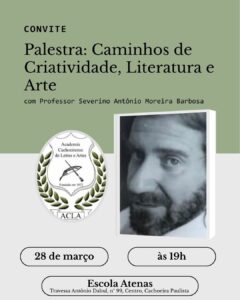 A Academia Cachoeirense de Letras e Artes (ACLA) convida para a palestra do professor Severino Antônio Moreira Barbosa, intitulada “Caminhos de Criatividade, Literatura e Arte”, a ser realizada no dia 28 de março de 2026, às 19h, nas dependências da Escola Atenas, situada na Travessa Antônio Dabul, no centro de Cachoeira Paulista.