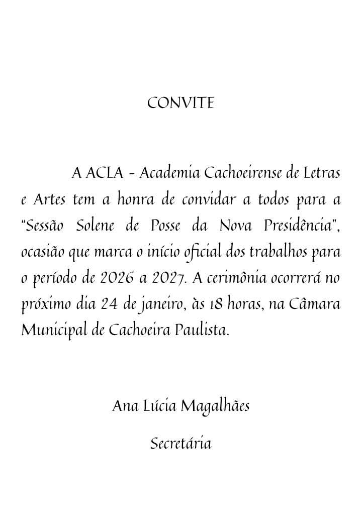 A ACLA – Academia Cachoeirense de Letras e Artes tem a honra de convidar a todos para a